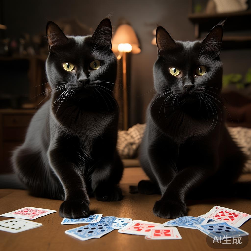 话音未落,两只黑猫一下跳过来,瞪着他。过了一会,它们暖和了,就开始要打牌。“咱们一块玩怎么玩?”小伙子满口答应。“给我们看看爪子怎么回事。”