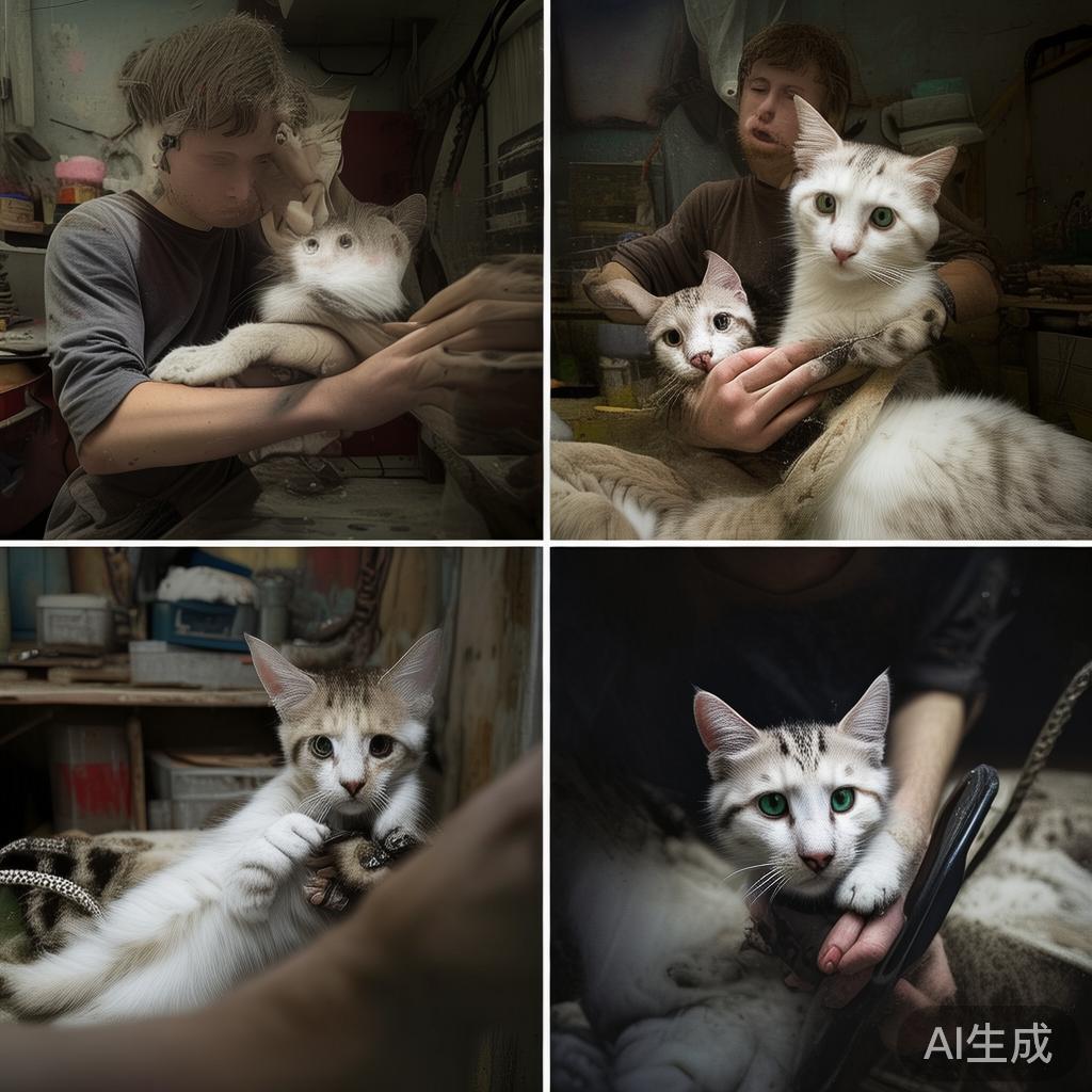 两只猫伸出了爪子,小伙子称赞:“嗬,您爪子太长了!”说着,搂着它们的脖子,把它们牢牢夹住,在工作台上给它们剪掉爪子。随后,又毫不留情地杀死了它们,扔到水池里。