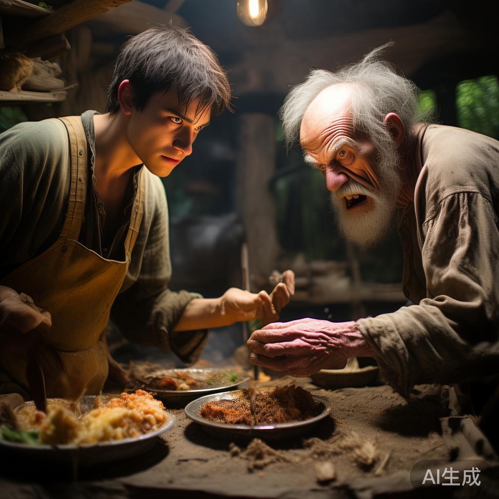 “来,搏斗一下。”老家伙吼道,带着小伙子穿越阴暗通道,来到熔炉前。老人举起斧头,猛砸一个铁坯,皮肤流露出残酷的寒光。