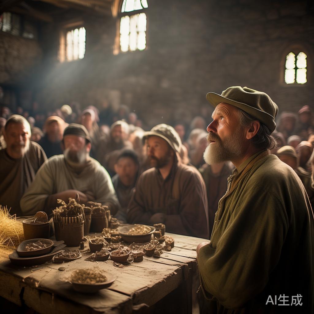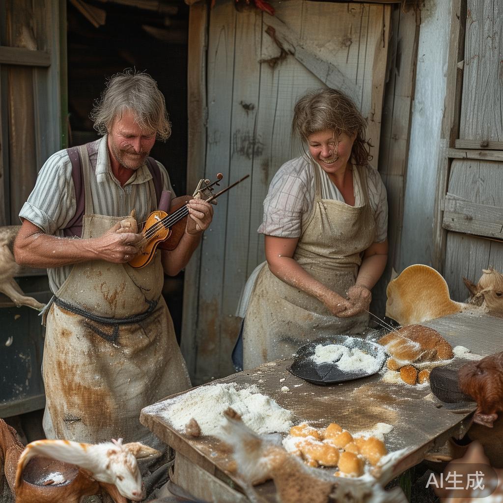当他们到达农夫的家,哈,这戏可就热闹了!院子里动物乱成一团,农妇正在杀鸡,还烙薄饼呢,牧师则提着小提琴在旁边乐呵呵的。侃友敲门,农妇问:“是谁呀?”