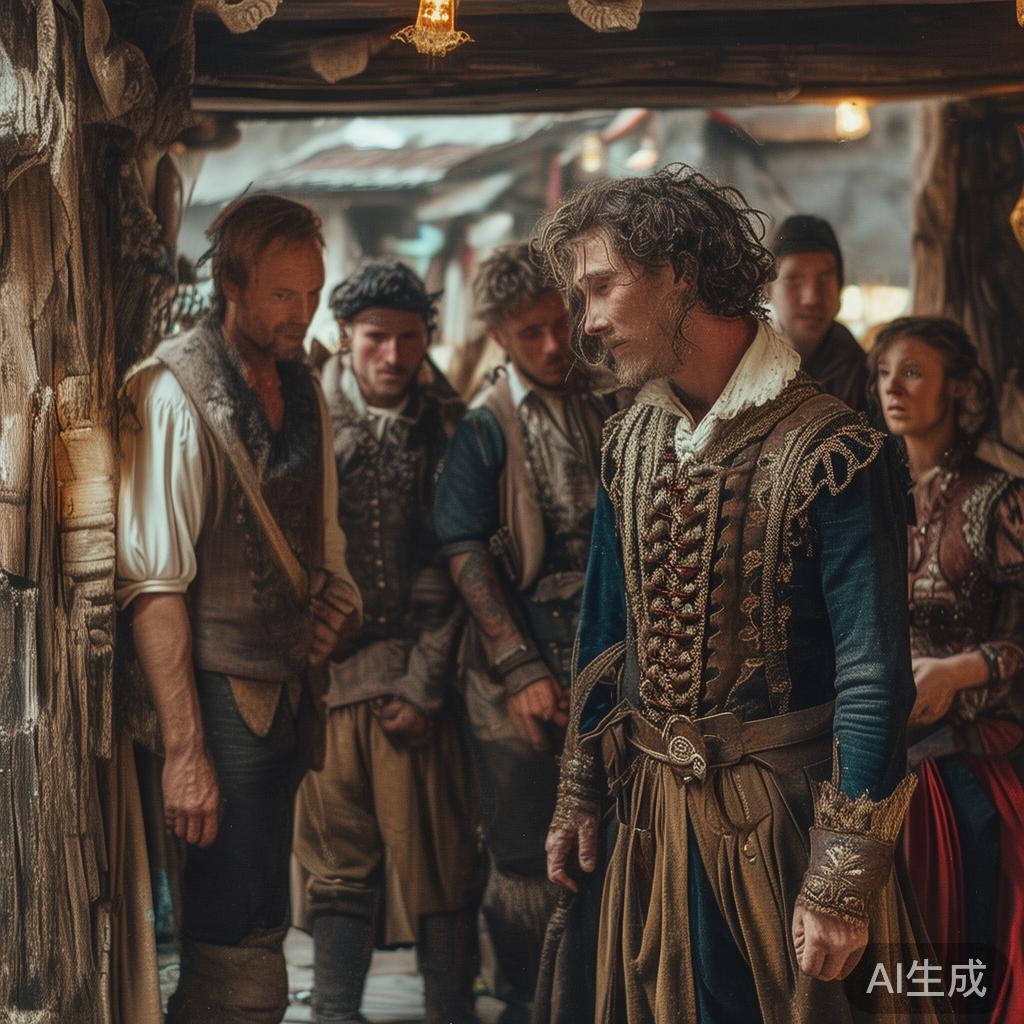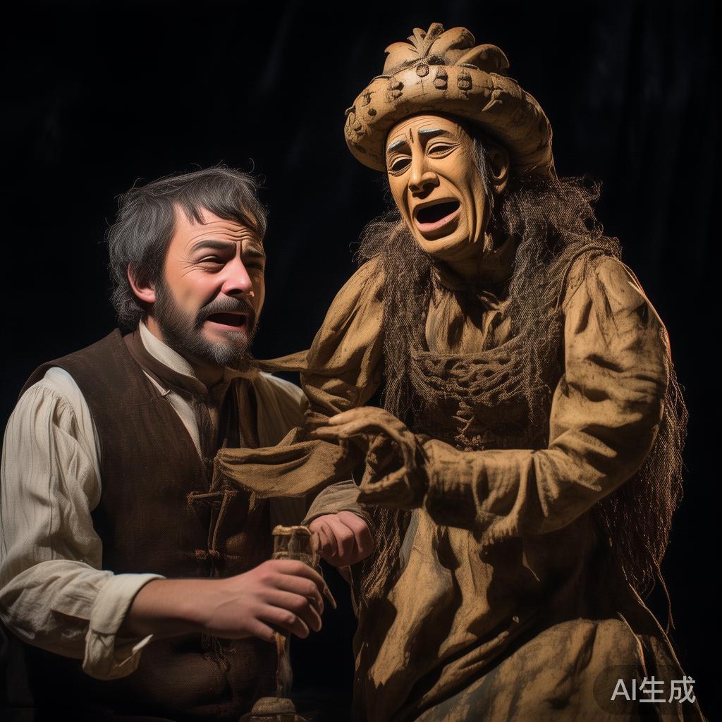 戏开始上演了,这剧中有国王与王后坐在奢华的宝座上,各自头顶金冠,衣裳优雅,显示其富贵气派。招牌中的漂亮木偶在开门关门,给室内带来新鲜空气。尽管角色融入各种喜剧元素,但就在王后准备离开舞台之际,令人诧异的是,胖屠夫未能控制好他的咆哮狗,竟一跃而起,紧紧抓住王后的纤细腰肢,大嚷:“咬呀,咬呀!”