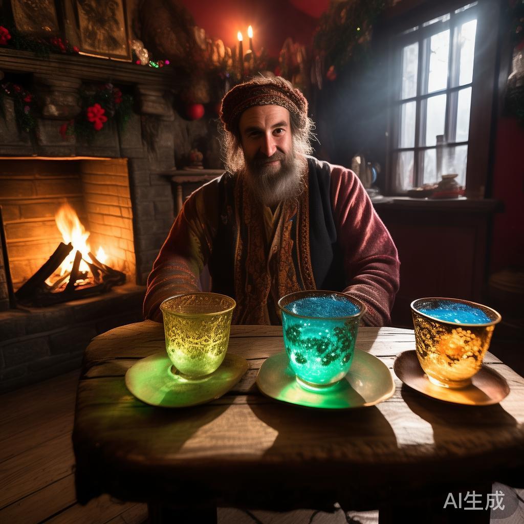 到了第二次拜访,恰逢新年,奥列开始讲述除夕夜的庆祝仪式。“你知道吗?每当钟声响起,我们举杯共饮,迎接新年的到来。有些人可能饮酒作乐,另一些则趴在床上继续梦游。可是,你注意过酒杯里的内容么?”他说着,眼中透出无尽智慧和调侃。“第一个是健康的杯子,里面盛的是洋溢活力的草;第二个则传递的是快乐欢唱的鸟儿的信息;第三个,则是一种小顽童般的幽默,提醒我们生活中的小乐趣。然而……”他顿了一下,又补充道:“酒杯背后也有黑暗面,比如潜伏在某个杯中的魔鬼,”这岂不是人的写照?