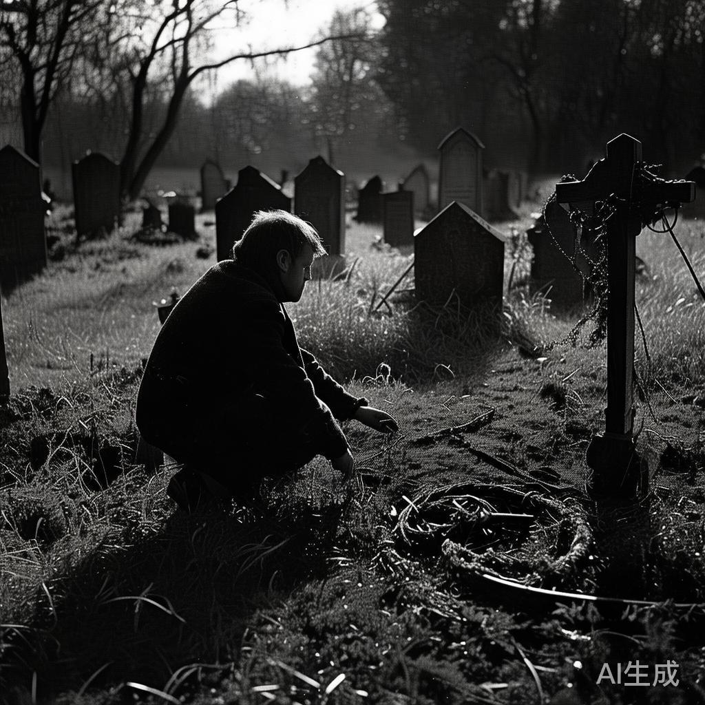 教堂墓地里坟墓密布,有些甚至长满荒草。此刻,约翰奈斯想起自己的父亲埋藏的地方,心中隐隐的不安,因为自己不能守护它。于是他蹲下来拔去杂草,把倒地的十字架扶正,将风吹去的花圈重新放回坟上。与此同时,他也在心中过了一遍:“现在我离家太远,应该有人照料我父亲的坟墓吧!”