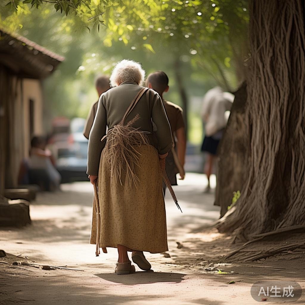 太阳高照,他们终于在一颗巨大的树下停下休息。这时,突然来了位老太婆——可怜的老人,驼着背,手拄拐杖,背负着一捆柴火,逐步接近街坊。她的裙兜里装着一些蒲棒和杨柳枝。当她靠近的时候,意外摔了一跤,痛苦而挺地大叫起来——可怜的老太婆,她腿骨折了!