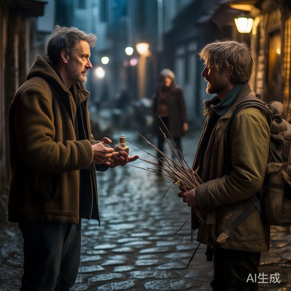 在墓地门口,一个年迈的乞丐拄着拐杖,佝偻着身体走近。约翰奈斯毫不犹豫地将所有的银币都给予他,随后就带着愉悦的心情继续踏上旅途。