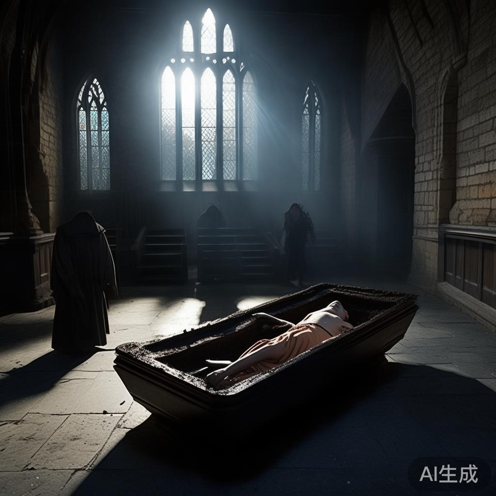 当他醒来时,正是半夜。然而暴风雨已经过去,明亮的月光透过窗户洒进来。教堂中央,一具敞开的棺材静静伫立,里面躺着尚未下葬的尸体。约翰奈斯并不害怕,因为内心安宁。他知道死人不会伤害他,真正可怕的是活人的恶劣行为。而此时,附近出现了两个心怀不轨的恶徒,他们试图对侧侧躺在棺材中的死者施加恶性攻击,不让其安息,想把他拖出去扔在门外——真是可怜的亡者呀!